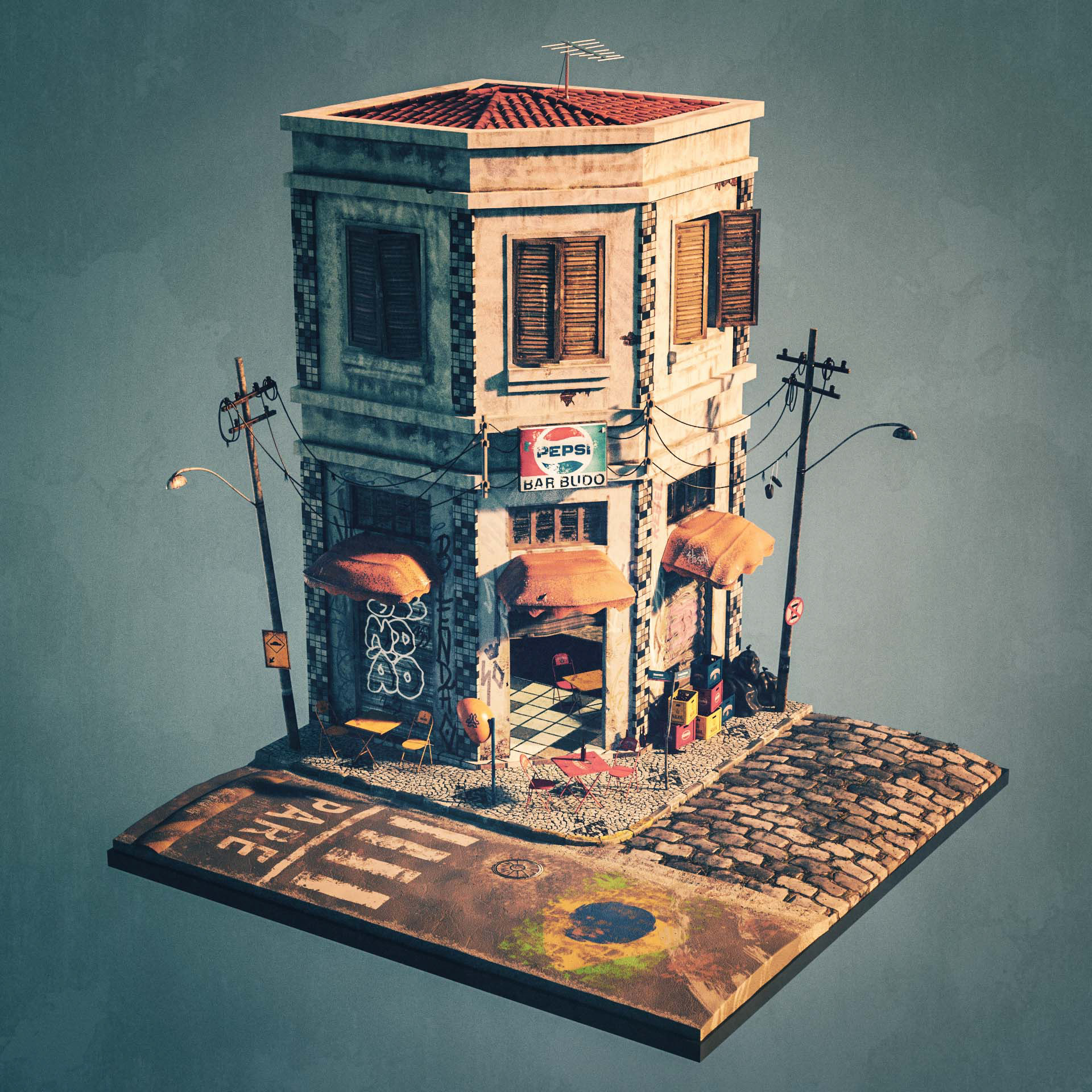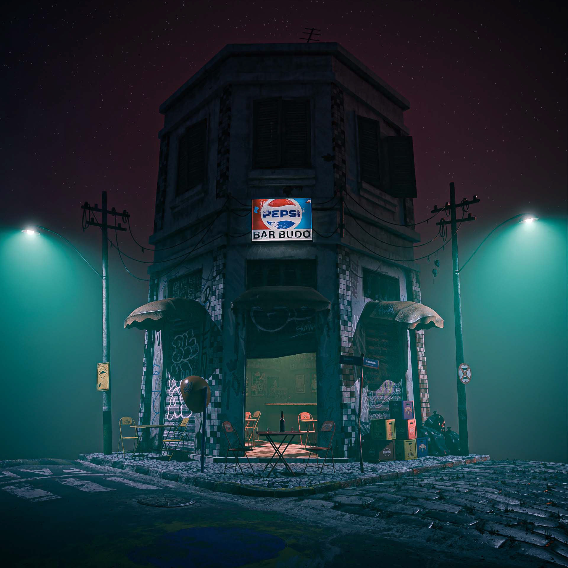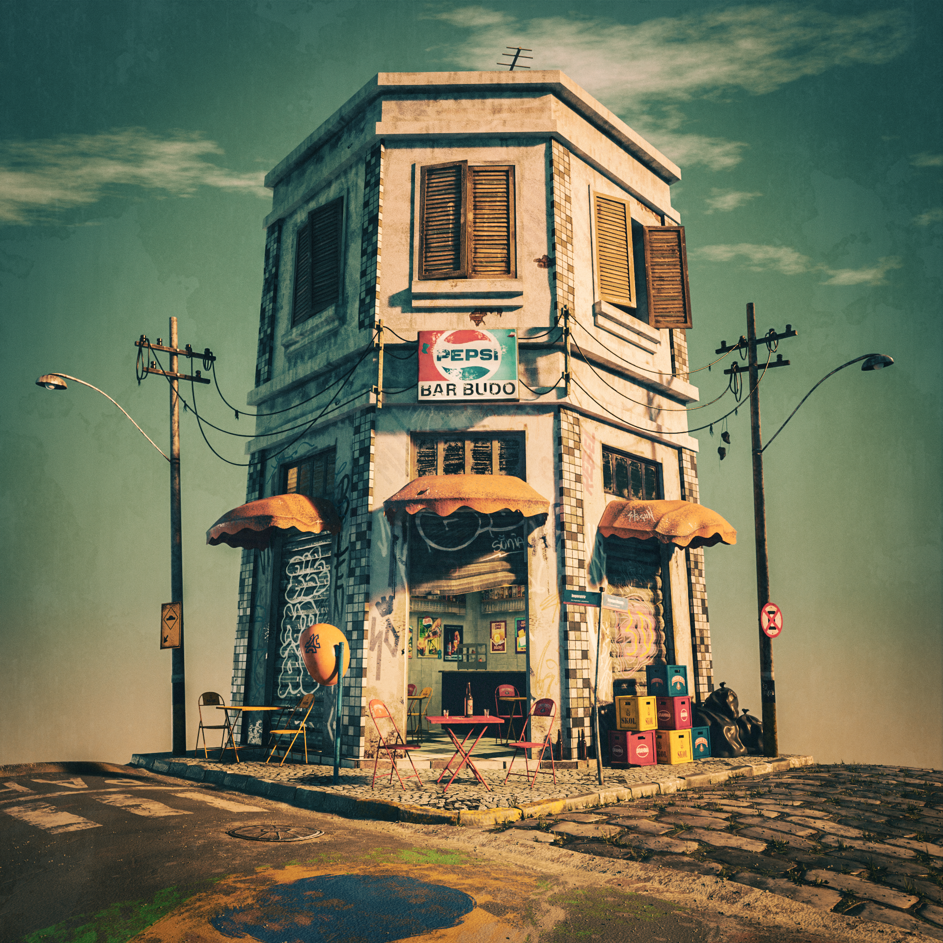It took me approximately two months to research and create this 3D scene, considering several characteristics of a traditional Brazilian bar from the 70s/80s such as architecture, furniture and cultural characteristics. My memories of those childhood days. Here is my tribute to my beloved grandfather.