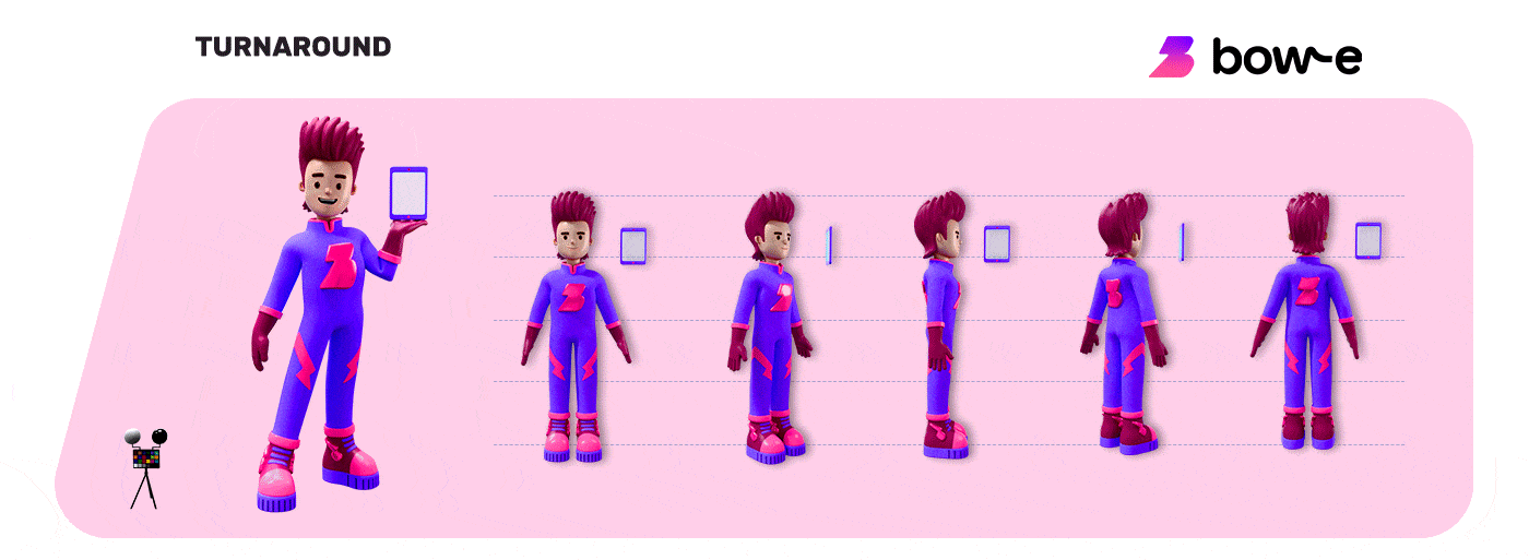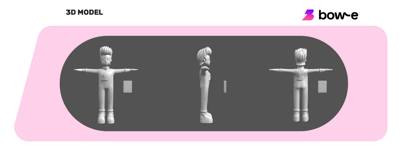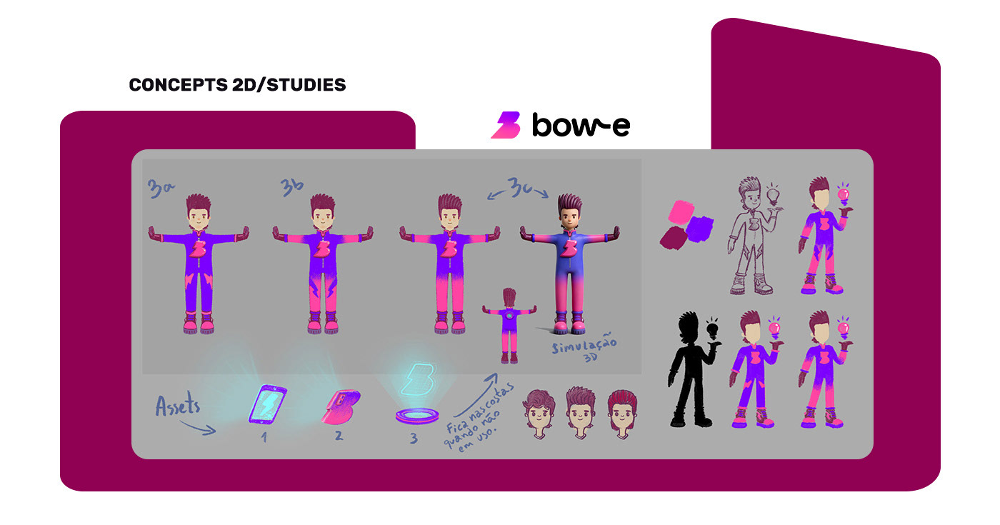 The character’s conception was driven by the desire to materialize Bow-e’s core values. The briefing introduced a playful yet strategic element: a visual homage to David Bowie, transforming the design process into an exercise in creativity and style. To achieve the necessary precision, the partnership with Bow-e’s branding team was essential. Through a constant exchange of references and brand assets, we translated abstract concepts into a solid design, capable of communicating the energy and modernity that the project demanded.