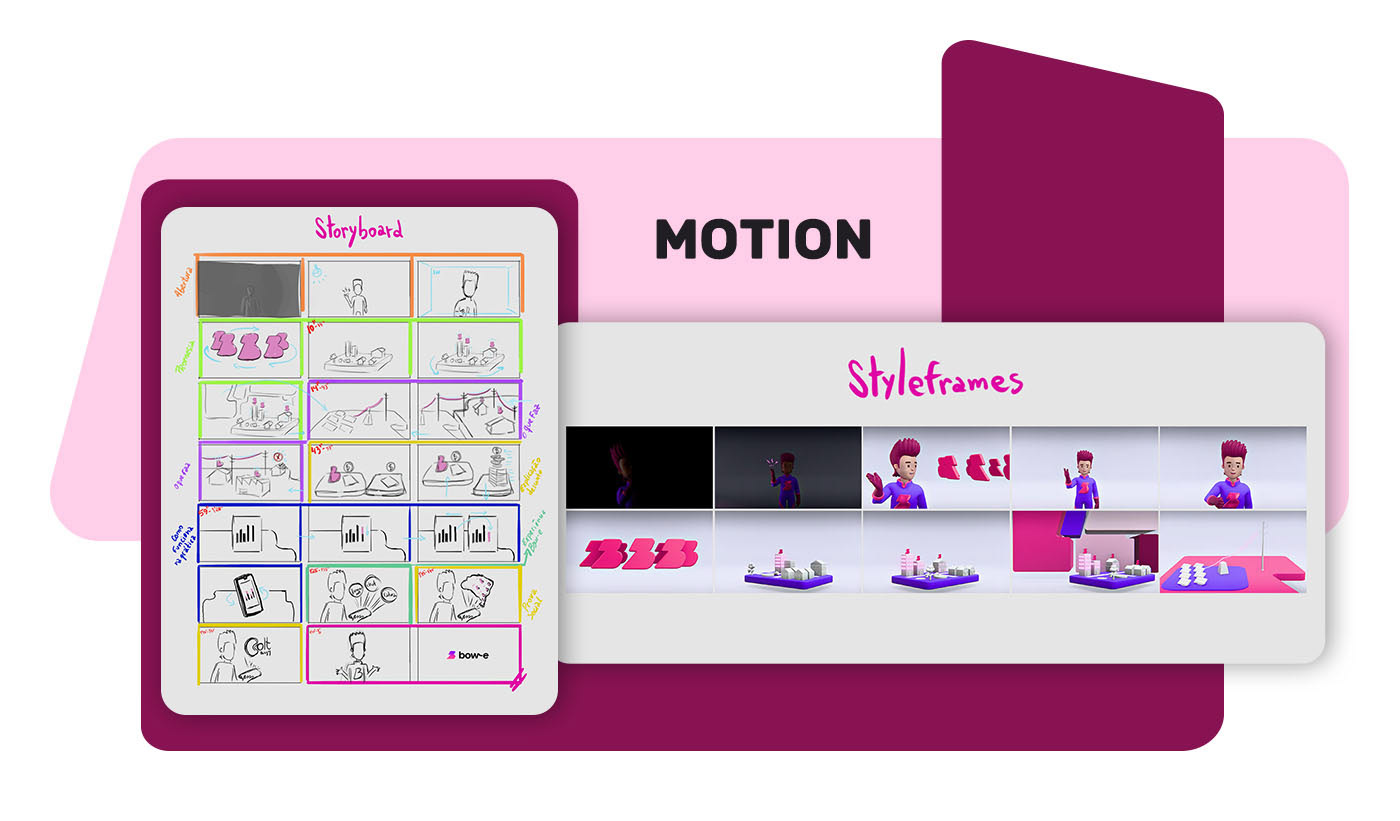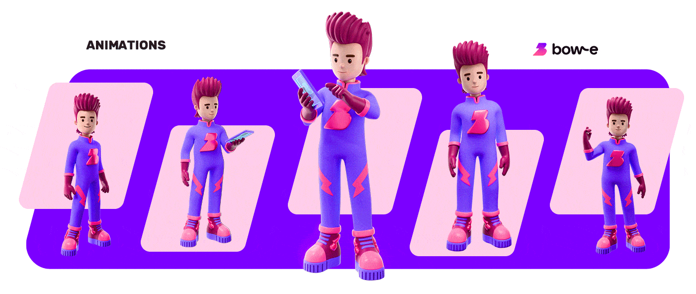 The character was engineered for flexibility, ensuring consistent application across the brand’s various digital ecosystems. In addition to developing the asset, we produced an animation that blends 3D techniques with motion design to explain Bow-e’s value proposition in a clear, engaging, and visually impactful way.