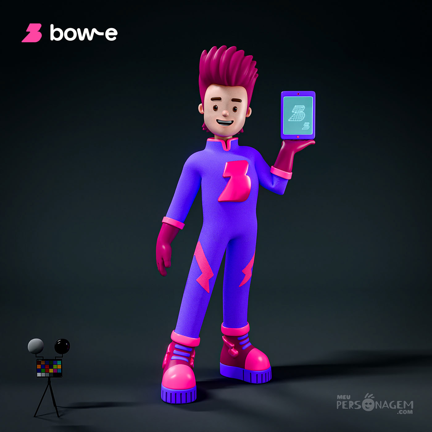 A concepção do personagem foi norteada pelo desejo de materializar os valores fundamentais da Bow-e. O briefing trazia um componente lúdico e estratégico: a alusão visual a David Bowie, transformando o processo de design em um exercício de criatividade e estilo. Para atingir a assertividade necessária, a parceria com o time de branding da Bow-e foi essencial. Através de um intercâmbio constante de referências e materiais de marca, traduzimos conceitos abstratos em um design sólido, capaz de comunicar a energia e a modernidade que o projeto exigia.