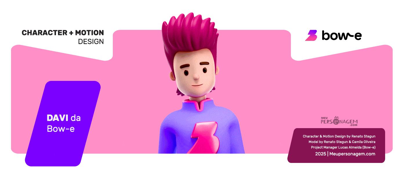 O personagem foi projetado com foco em flexibilidade, permitindo sua aplicação consistente em diferentes ecossistemas da marca. Além do desenvolvimento do asset, criamos uma peça de animação que combina técnicas de 3D e Motion Design para explicar a proposta de valor da Bow-e de forma didática e visualmente impactante.